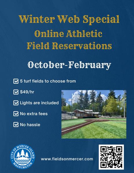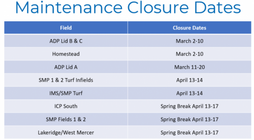 The only fields open for use during this time are synthetic turf fields at: the South Mercer Play Fields, Islander Middle School, and Island Crest Park North field.