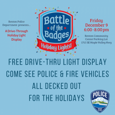 On Friday, December 9 from 6-8pm, Mercer Island Police Department will go head-to-head in a fierce holiday light decorating competition with Police Departments from Renton, Issaquah, Bellevue, and more! The event will take place at the Renton Community Center.