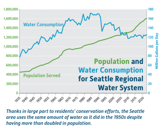 Water demand varies, depending on seasonal weather conditions. Summer and early fall months are typically times when the greatest amount of water is used, primarily for irrigation. The system provides an average of 160 million gallons per day (MGD) for the region, but the goal of the regional water conservation program for 2019-2028 is to keep the total average annual retail water use of the members of the Saving Water Partnership under 110 million gallons a day (MGD) through 2028, despite forecasted population growth, by reducing per capita water use.