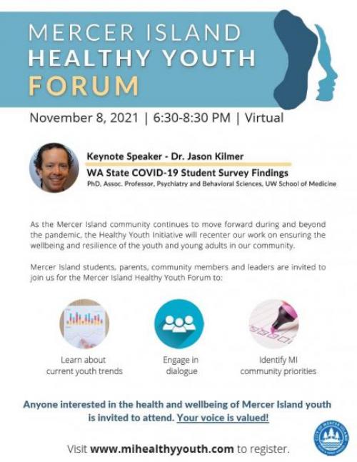 Mercer Island students, parents, community members and leaders are invited to join us for the Mercer Island Healthy Youth Forum to learn about current youth trends from Keynote Speaker Dr. Jason Kilmer, Assoc. Professor of Psychiatry and Behavioral Sciences at the University of Washington, who will share key findings from the WA State COVID-19 Student Survey.